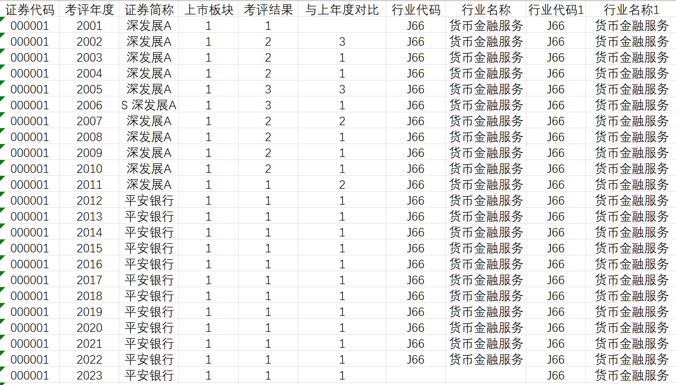 3.资料范围:4.5万个样本,5300家企业,具体指标包括 证券代码 考评年度 证券简称 上市板块 考评结果 与上年度对比 行业代码 行业名称
