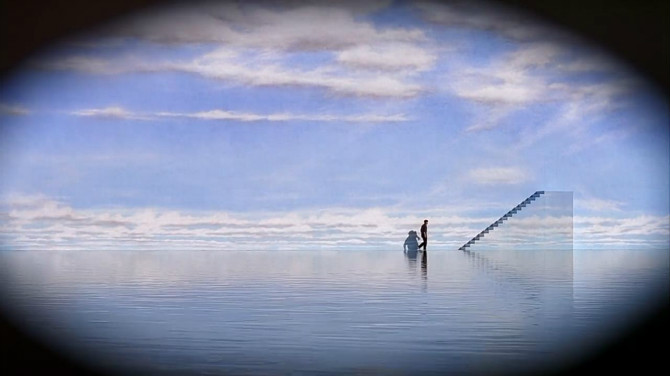 在这一条路一直行走下去,是一个圆圈,或者是一个轮还,风物景致固然美丽,但却无法在每天清晨到黄昏的时间里展现出自然的风采。“早上好!假如我再也碰不到你,那么……也祝你下午好,晚上好!”看看时间,对对钟表,幽默说一声:“一切如旧!”出门而去的脚步原来是处在早已注定的安排里。然而,就是在这样的圆圈当中,一个苍穹的笼罩外面将会是怎样的世界?从梦出发,从幻想索取信息的来源,夜的静美可以让人变得更加飘渺虚无,甚至从未存在过这个世间。那一部部摄像机突然间以广角的拍摄角度继续向远方伸拉,我们所生活的这个环境只是万界当中的一粒尘子,于万千颗粒之中以独特的思想行走在平常无奇的一个漩涡里。那么,继续往外行走呢,黑暗之后可能是聚白的世界,那里也会有像我们所生活的模样,每个人每天正常出门,正常下班,穿梭在时间的缝隙里等待未知的结果。他们的眼神和我们一样具有穿透力,想象着在界外也是一个被光明笼罩的世界,他们的生活也如一粒尘子般以独特的思想行走在平常无奇的一个漩涡里。最后,每个人都会发现,我们只是被时间随意抛弃的从无重要的灰尘。而我们本身,具有无数个世界。这一个画面并不难想象,只要闭上眼睛去看这个世界就一目了然了。那是一片海。但却少有人涉足。