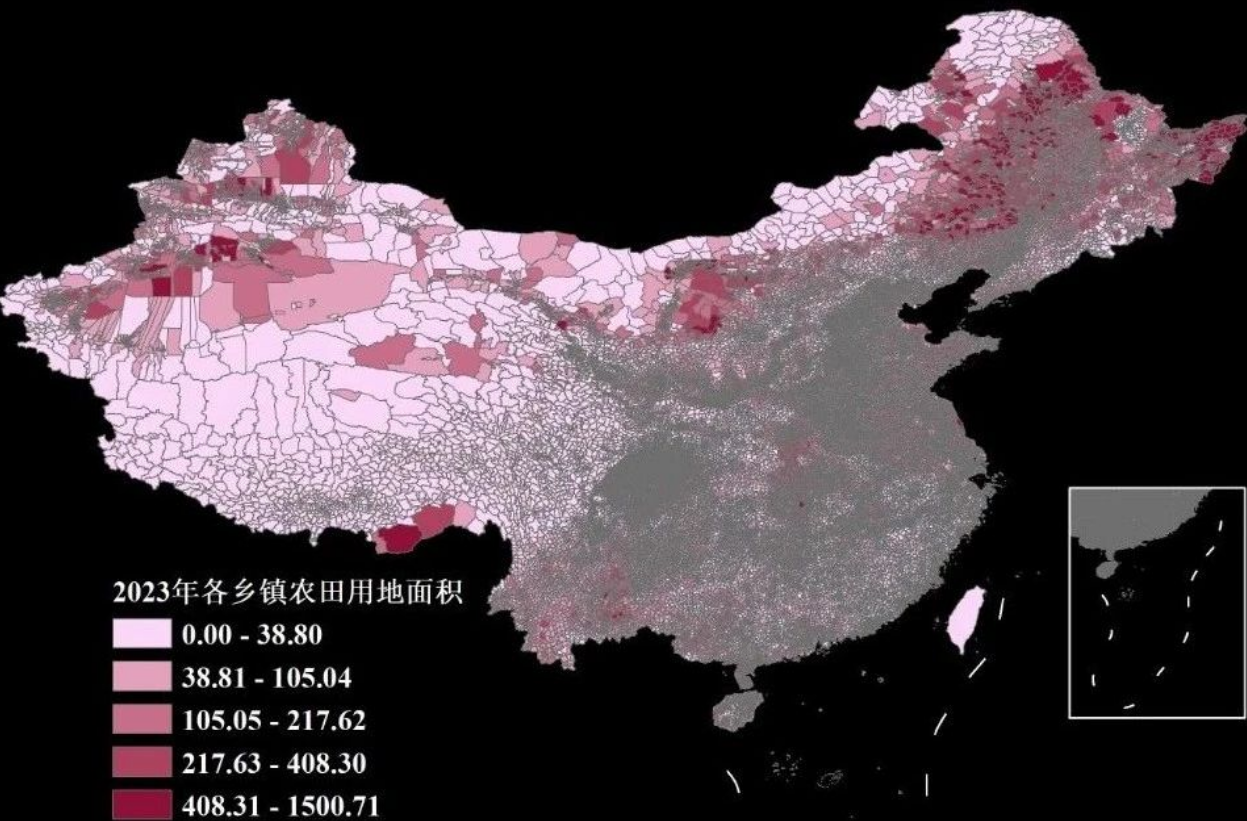 每个Shp文件汇总年度各类土地覆盖面积,数据字段包括9种用地面积,分别为农田(Cropland)、森林(Forest)、草原(Grassland)、水域(Water)、裸地(Barren)、不透水面(Impervious)、灌木(Shurb)、湿地(Waterland)、冰雪(Snow_Ice)。我们以2023年的农田数据为例来预览一下各对于乡镇行政区划数据,该数据较难获取,我们综合对比后,采用的学研录公众号分享的乡镇边界数据的数据: