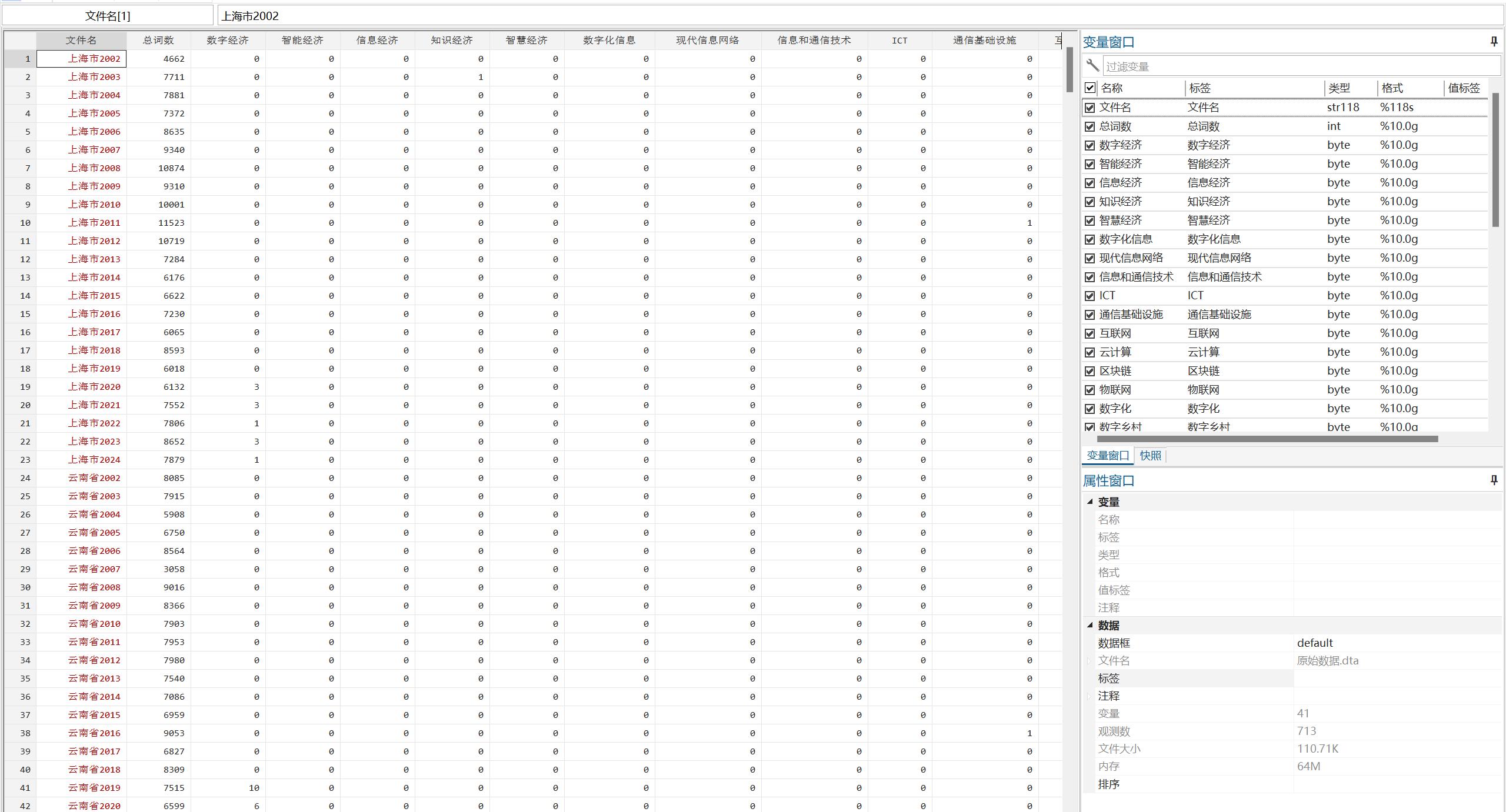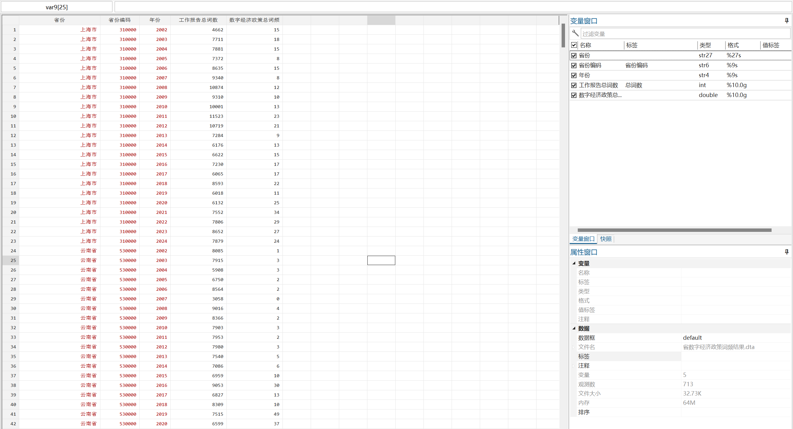 处理说明:原始数据为使用Python对地方ZF工作报告进行文本分析后获得(jieba分词,停用词表使用哈工大停用词表),后续使用Stata进行整理,最终形成面板数据形式
