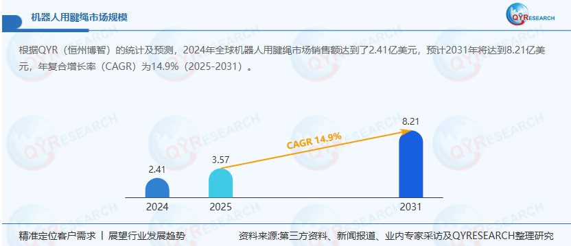 据市场研究机构预测,全球机器人用腱绳市场规模预计将在未来几年内实现显著增长。2031年全球机器人用腱绳市场销售额预计将达到55.9亿元,年复合增长率(CAGR)为14.9%(2025-2031)。这一增长主要得益于以下几个驱动因素: