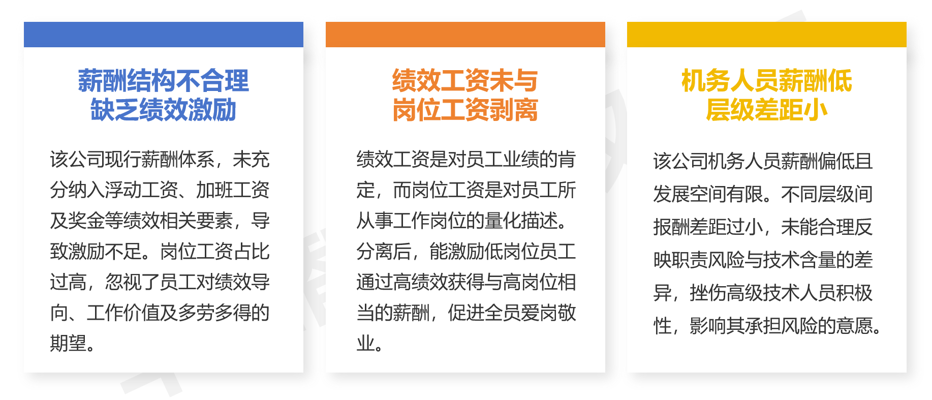 该公司的机务人员,尤其是技术人员,薪酬偏低且发展空间有限,影响其积极性与留存倾向。此外,不同层级间报酬差距过小,未能合理反映职责风险与技术含量的差异,挫伤高级技术人员积极性,影响其承担风险的意愿。