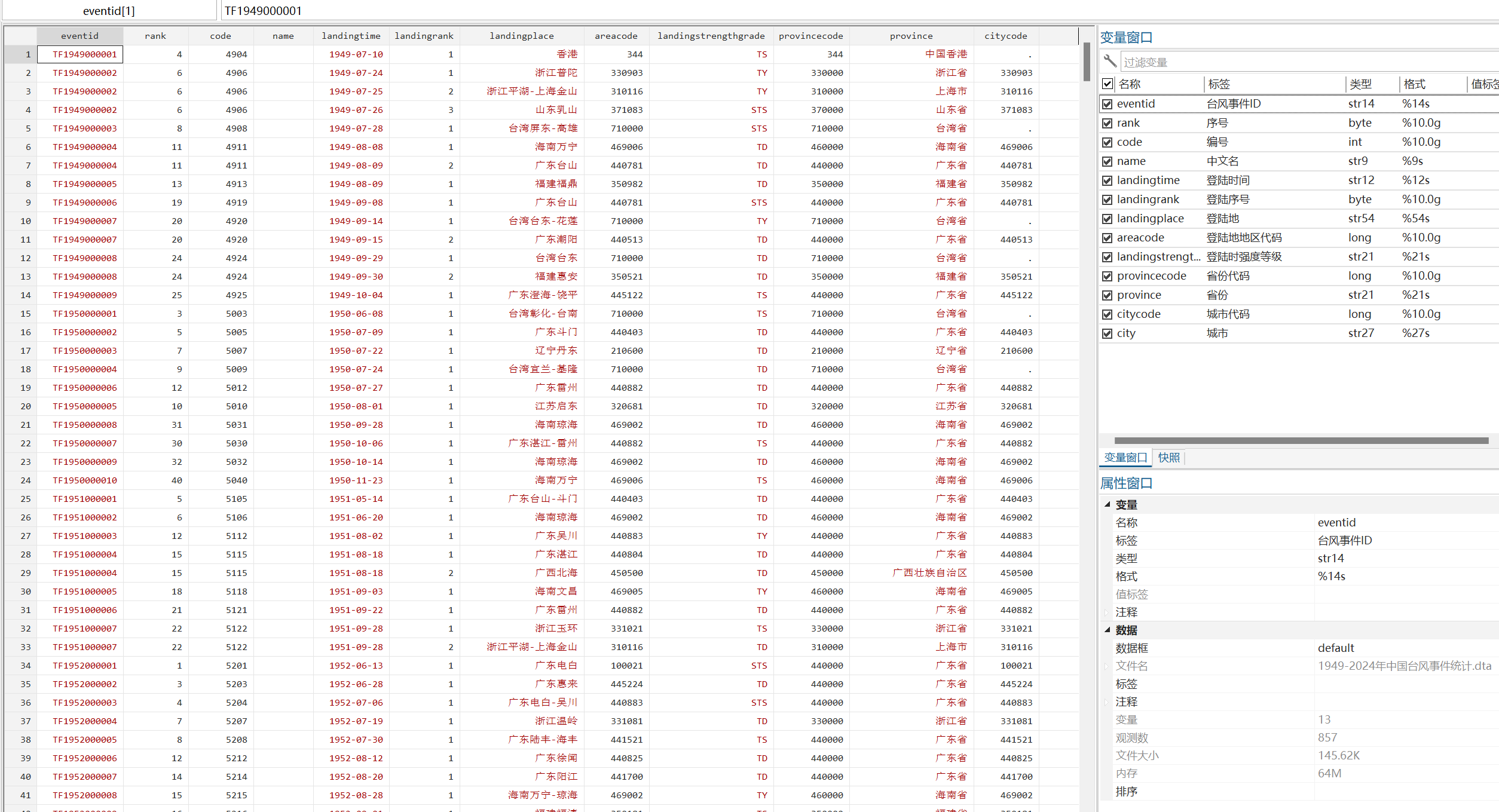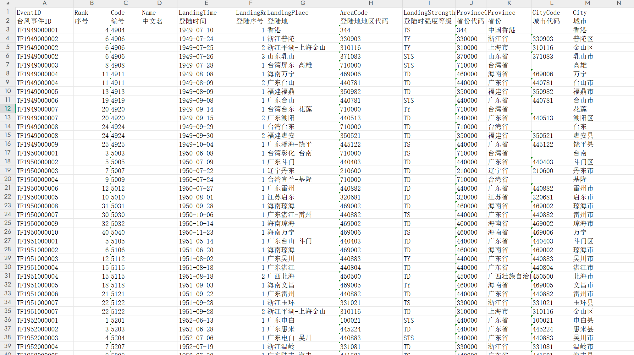 ▪ 数据说明:中国台风事件统计包括台风事件ID、序号、编号、中文名、登陆时间、登陆序号、登陆地、登陆地地区代码、登陆时强度等级、省份代码、省份、城市代码、城市等变量,并提供.xlsx和.dta两种格式的数据,数据可用excel或stata打开。