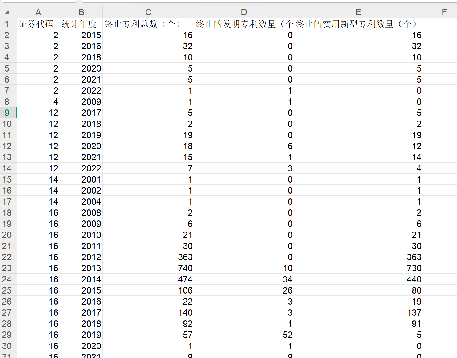 ▪ 数据说明:上市公司专利终止情况整理了上市公司股票代码、会计年度、当年终止的专利数量总和、当年终止的发明专利数量、当年终止的实用新型专利数量等变量。文件提供.xlsx和.dta两种格式,可使用stata或excel打开。