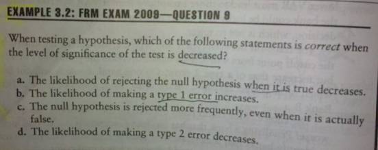 sorry我看反了,书上选a是对的,significance level减小,e.g.5%--->1%, P(type I error) 也就减小了,这就是a答案的意思。B和D都是错的,BD反过来才对,P(TYPE I ERROR) DECREASE, P(TYPE II ERROR) INCREASE