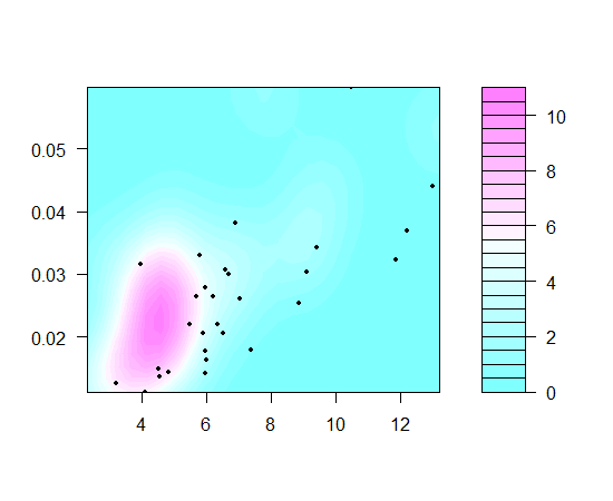 contour(xy.kde, xlim = c(0, 0.07), ylim = c(0, 15),col = "red")