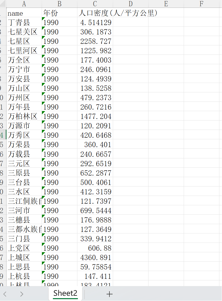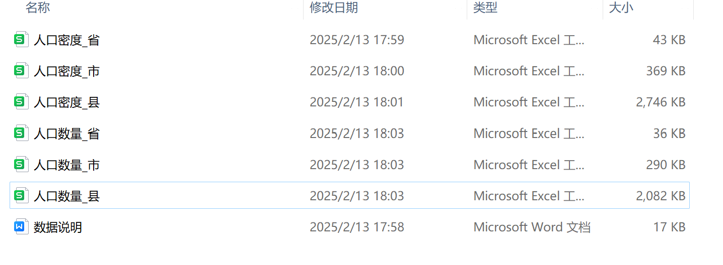 原始数据为长时序的全国人口与人口密度的栅格数据,但考虑到栅格数据使用起来对大家并不方便,整理成省市县的面板数据,其中包含各省市县的人口数量与人口密度(人/平方公里)