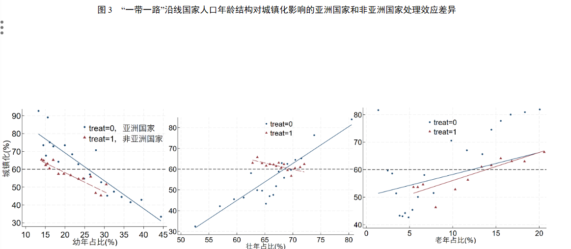 plt.suptitle('"一带一路"沿线国家人口年龄结构对城镇化影响的亚洲国家和非亚洲国家处理效应差异', fontsize=12)