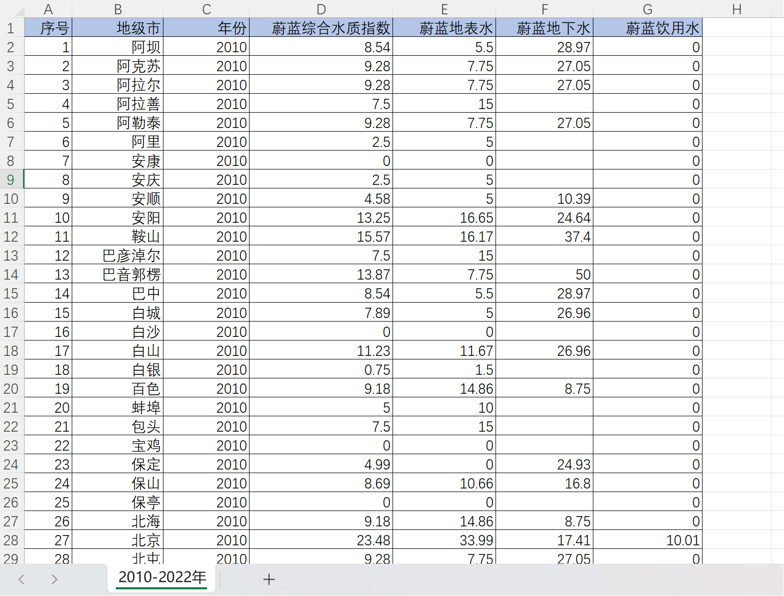 数据名称:地级市水质状况监测水环境公开数据10-22年蔚蓝水质指数