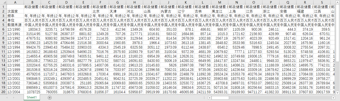 存款 存款:定期 存款:活期 存款:农户 存款:北京 存款:天津 存款:河北 存款:山西 存款:内蒙古 存款:辽宁 存款:吉林 存款:黑龙江 存款:上海 存款:江苏 存款:浙江 存款:安徽 存款:福建 存款:江西 存款:山东 存款:河南 存款:湖北 存款:湖南 存款:广东 存款:广西 存款:海南 存款:四川 存款:重庆 存款:贵州 存款:云南 存款:西藏 存款:陕西 存款:甘肃 存款:青海 存款:宁夏 存款:新疆 定期存款:北京 定期存款:天津 定期存款:河北 定期存款:山西 定期存款:内蒙古 定期存款:辽宁 定期存款:吉林 定期存款:黑龙江 定期存款:上海 定期存款:江苏 定期存款:浙江 定期存款:安徽 定期存款:福建 定期存款:江西 定期存款:山东 定期存款:河南 定期存款:湖北 定期存款:湖南 定期存款:广东 定期存款:广西 定期存款:海南 定期存款:四川 定期存款:重庆 定期存款:贵州 定期存款:云南 定期存款:西藏 定期存款:陕西 定期存款:甘肃 定期存款:青海 定期存款:宁夏 定期存款:新疆 活期存款:北京 活期存款:天津 活期存款:河北 活期存款:山西 活期存款:内蒙古 活期存款:辽宁 活期存款:吉林 活期存款:黑龙江 活期存款:上海 活期存款:江苏 活期存款:浙江 活期存款:安徽 活期存款:福建 活期存款:江西 活期存款:山东 活期存款:河南 活期存款:湖北 活期存款:湖南 活期存款:广东 活期存款:广西 活期存款:海南 活期存款:四川 活期存款:重庆 活期存款:贵州 活期存款:云南 活期存款:西藏 活期存款:陕西 活期存款:甘肃 活期存款:青海 活期存款:宁夏 活期存款:新疆 储户数 储户数:北京 储户数:天津 储户数:河北 储户数:山西 储户数:内蒙古 储户数:辽宁 储户数:吉林 储户数:黑龙江 储户数:上海 储户数:江苏 储户数:浙江 储户数:安徽 储户数:福建 储户数:江西 储户数:山东 储户数:河南 储户数:湖北 储户数:湖南 储户数:广东 储户数:广西 储户数:海南 储户数:四川 储户数:重庆 储户数:贵州 储户数:云南 储户数:西藏 储户数:陕西 储户数:甘肃 储户数:青海 储户数:宁夏