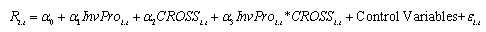 这是我的模型,InvPro是连续变量,CROSS是虚拟变量,ControlVariables是控制变量,我重点要观察的系数是InvPro*CROSS的系数a3。但是在SPSS回归时InvPro和CROSS老是被剔除,回归结果如下。我试着用岭回归来解决问题,但发现根本没法做岭回归,SPSS老是提示存在“INV是奇异矩阵”等一系列错误。请问我该如何解决这个问题。