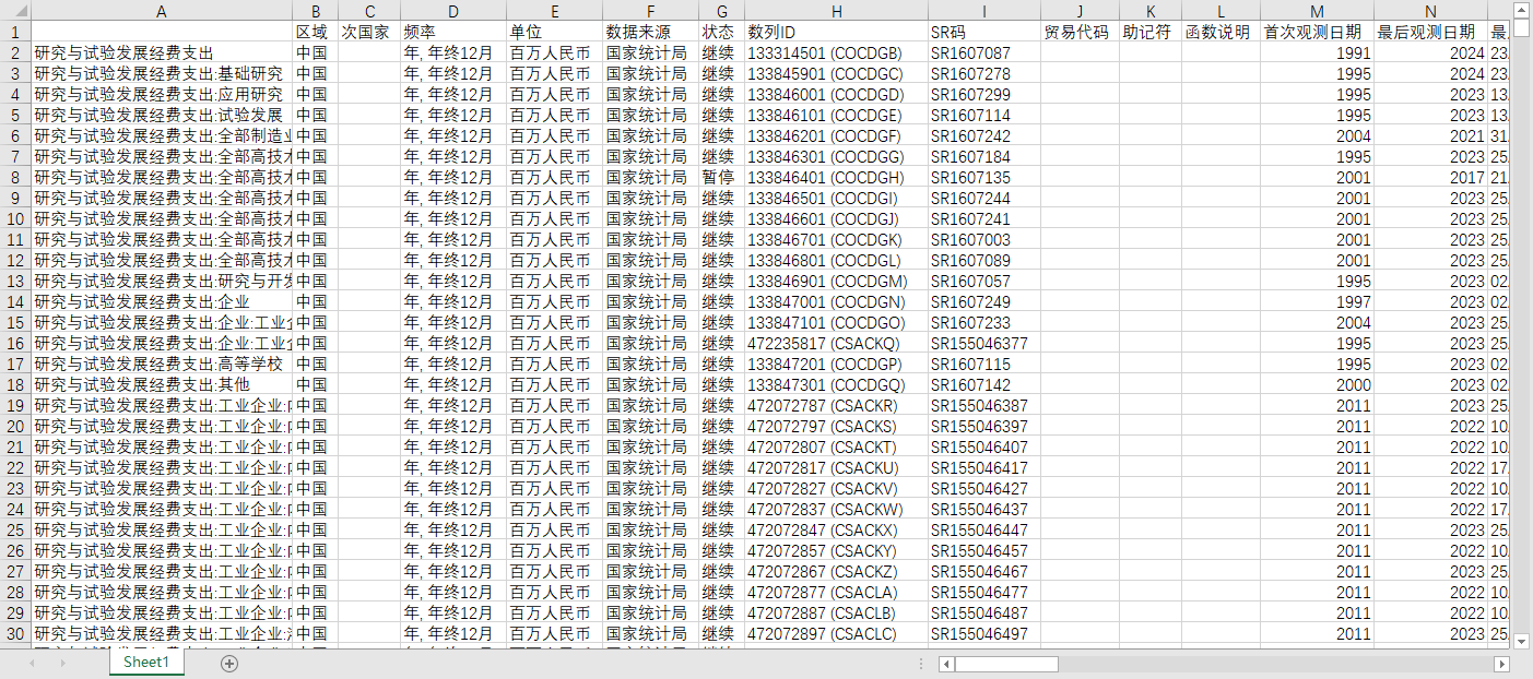 全国科学研究研究与试验发展经费支出经费投入强度人员数产出新产品销售收入1995-2023全时当量高技术产业