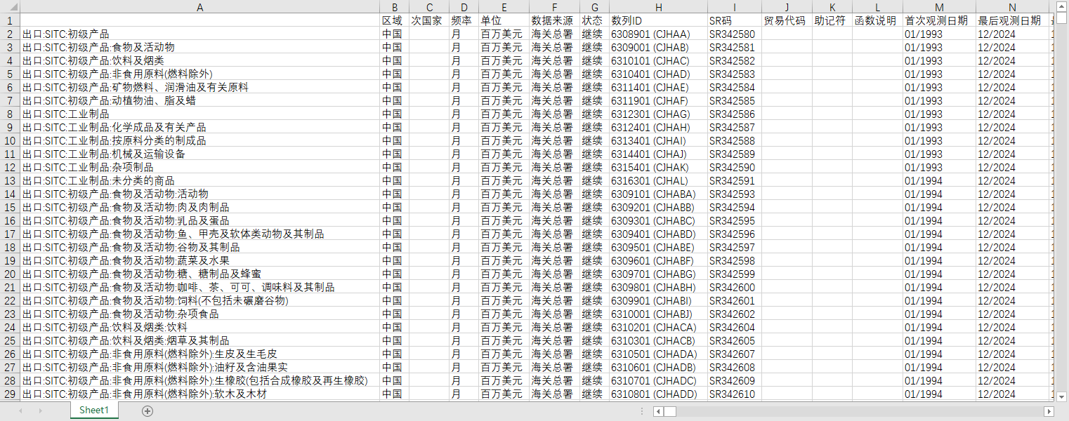 进出口国际贸易全国进口出口SITC分类1993-202412月度初级产品工业制品机械设备纺织服装等