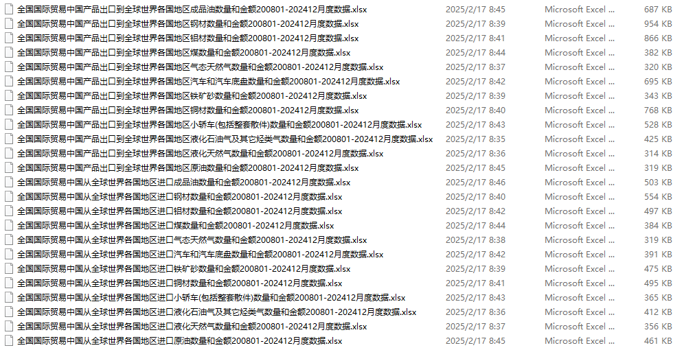 全国进出口全球世界各国地区2008-2024煤原油成品油液化石油气钢材铁矿砂铝材汽车轿车等国际贸易