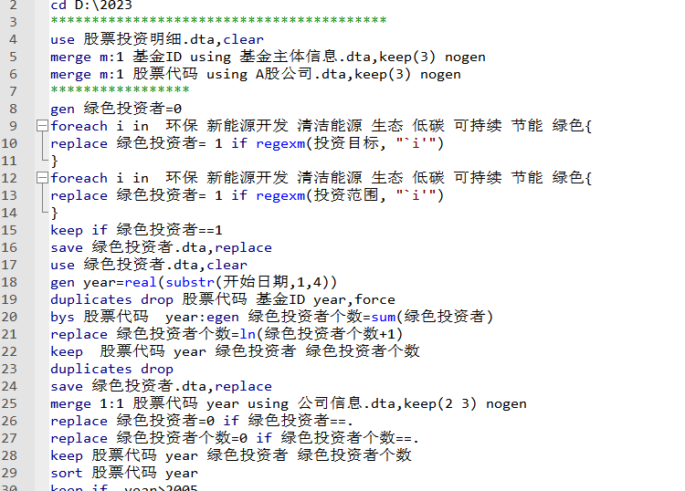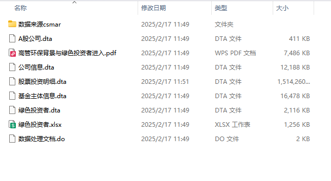 参考C刊《数量经济技术经济研究》王辉(2022)老师的研究,将其基金市场系列中的“基金主体信息表”与“股票投资明细表”进行匹配,从而获得对上市企业进行投资的基金明细表。然后,手工查询各基金的“投资目标”与“投资范围”中是否包含“环保”“生态”“绿色”“新能源开发”‘清洁能源’“低碳“可持续”“节能”等与环境相关的词汇,若存在,则认为该企业具有绿色投资者,反之则没有,并在此基础上统计当年该企业包含的绿色投资者数量。