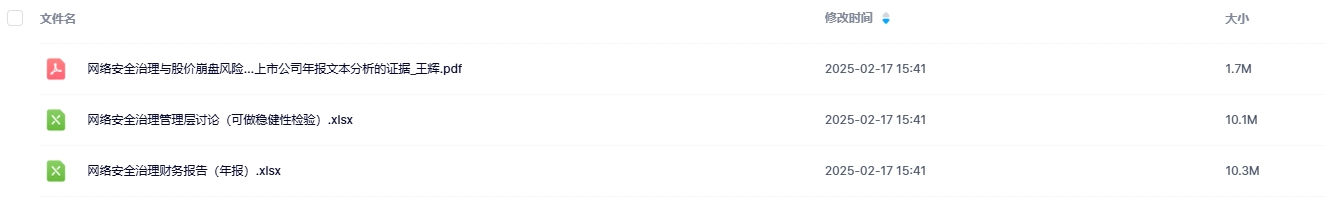 三、参考文献[1] 王辉, 何冬昕, 陈旭, 等. 网络安全治理与股价崩盘风险——基于上市公司年报文本分析的证据[J/OL]. 金融评论, 2024,(01): 86-106