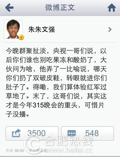 赵普微博原文:“转发来自调查记者的短信。同志们:不要再吃老酸奶(固体形态)和果冻,尤其是孩子,内幕很可怕,不细说。”
