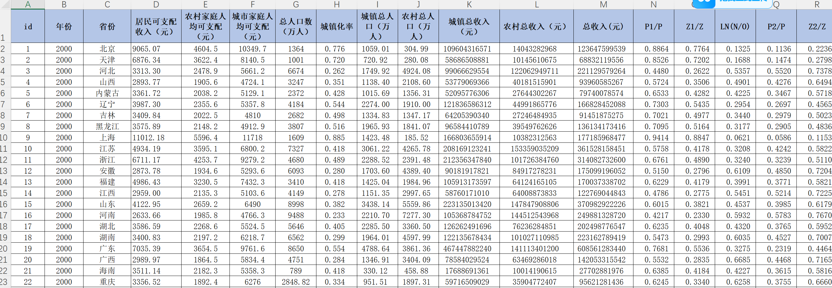id、年份、省份、居民可支配收入(元)、农村家庭人均可支配(元)、城市家庭人均可支配(元)、总人口数(万人)、城镇化率、城镇总人口(万人)、农村总人口(万人)、城镇总收入(元)、农村总收入(元)、总收入(元)、P1/P、Z1/Z、LN(N/O)、P2/P、Z2/Z、LN(Q/R)、泰尔指数。