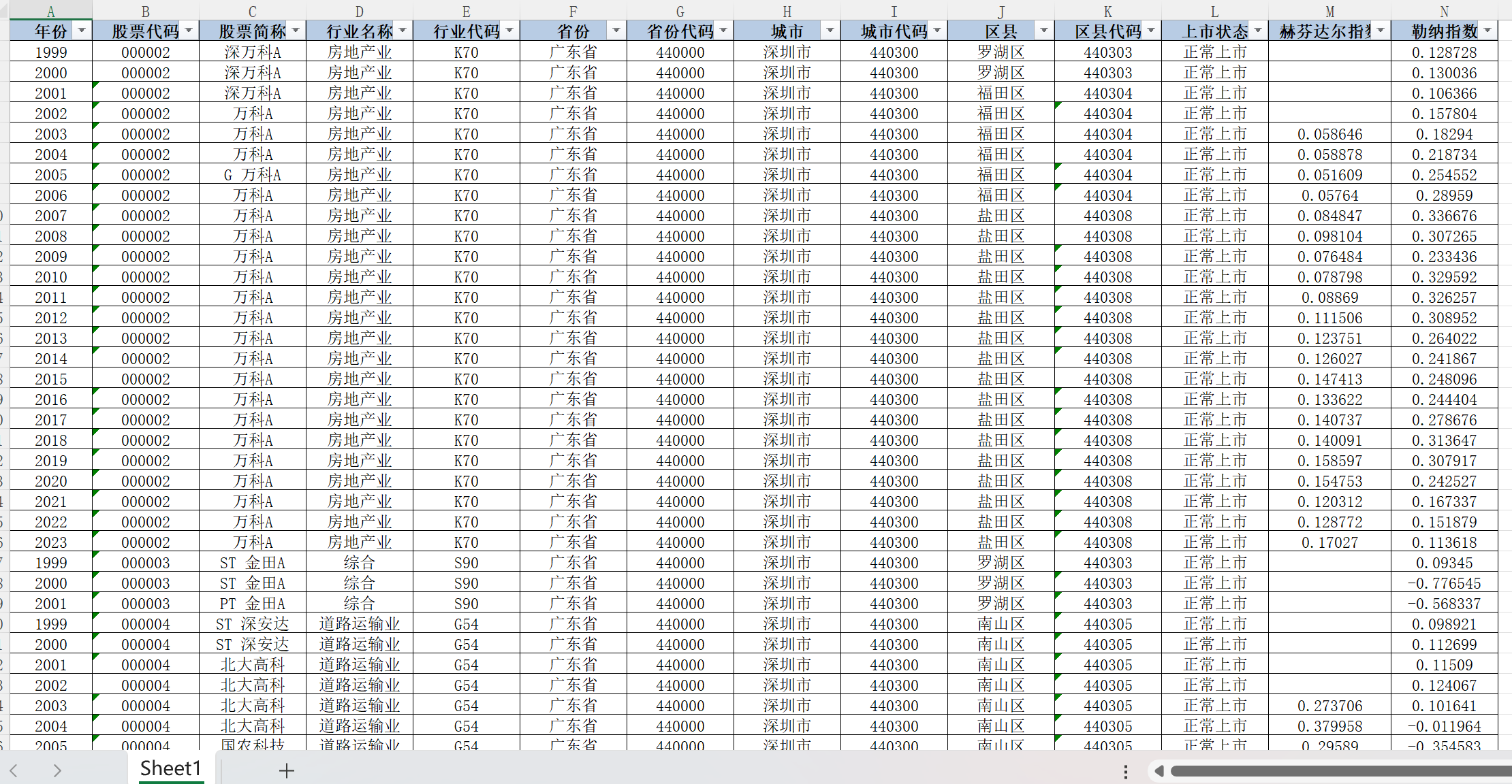 年份 股票代码 股票简称 行业名称 行业代码 省份 省份代码 城市 城市代码 区县 区县代码 上市状态 赫芬达尔指数 勒纳指数