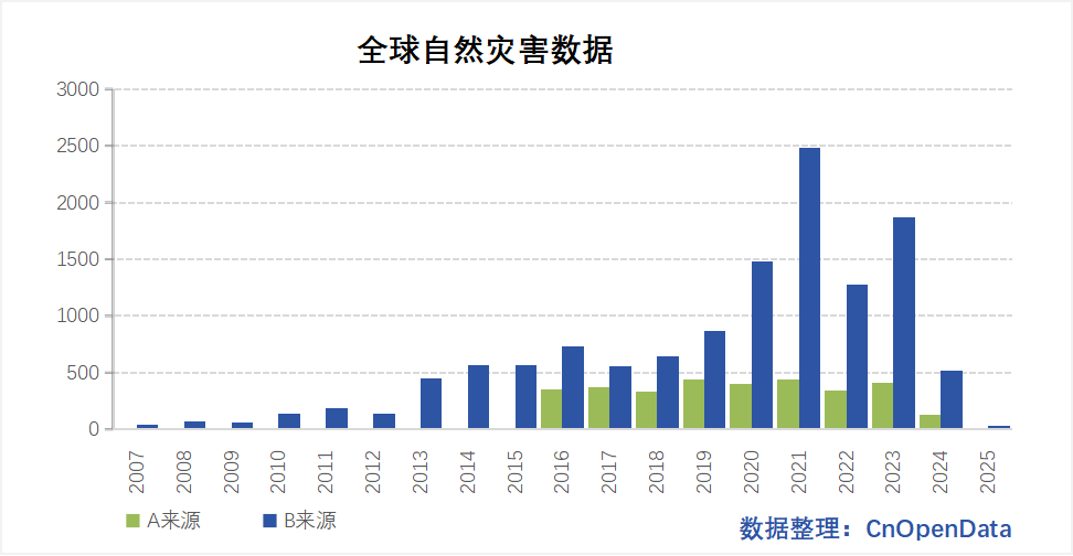 两个来源的全球自然灾害信息,A来源数据总量为三千二百条,B来源数据总量为一万两千条