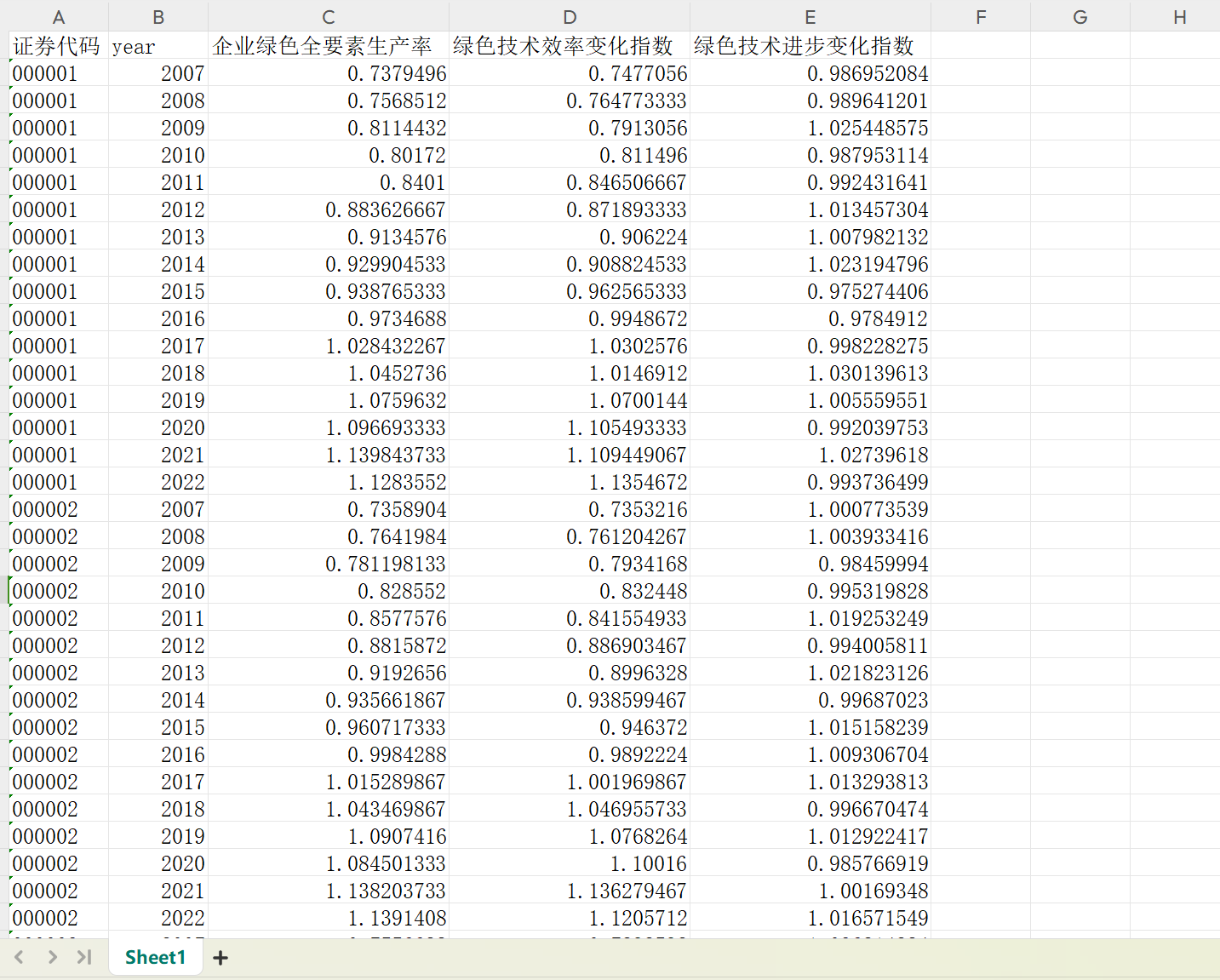 上市公司绿色全要素生产率是衡量企业在实现绿色发展的过程中,如何有效地利用劳动、资本、能源等资源进行生产的综合效率。本分享数据涵盖2500+家上市公司,数据年份为2007-2022年,共46424条样本,含证券代码、年份、绿色全要素生产率、绿色技术效率变化指数、绿色技术进步变化指数。