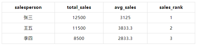 SELECT 1 AS id, '张三' AS salesperson, 1000 AS amount UNION ALL