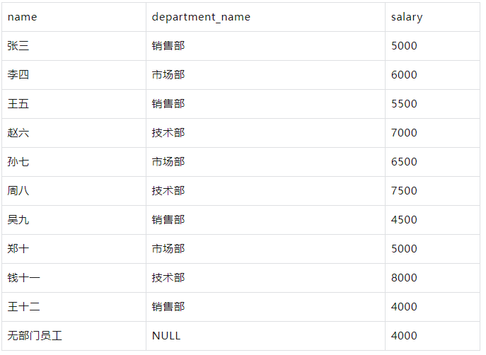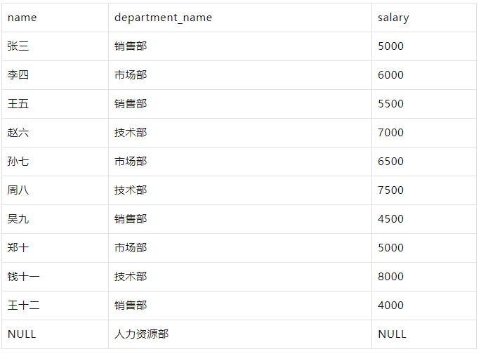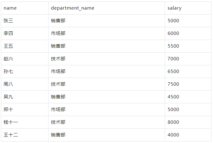SELECT 1 AS id, '张三' AS name, 1 AS department_id, 5000 AS salary UNION ALL