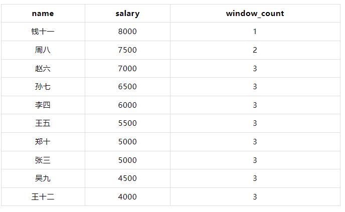 💡在这个示例中,COUNT(*) OVER (ORDER BY salary DESC ROWS BETWEEN 2 PRECEDING AND CURRENT ROW) 计算当前行及其前两行的行数。