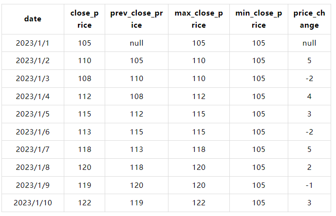 LAG(close_price) OVER (ORDER BY date) AS prev_close_price,