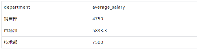 SELECT department, AVG(salary) AS average_salary