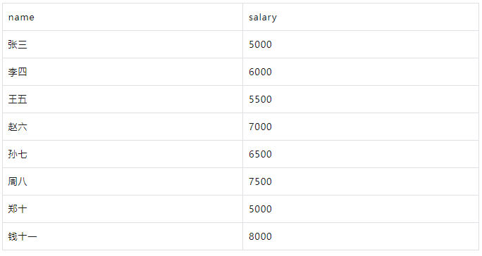 SELECT 8, '郑十', '市场部', 5000 UNION ALL