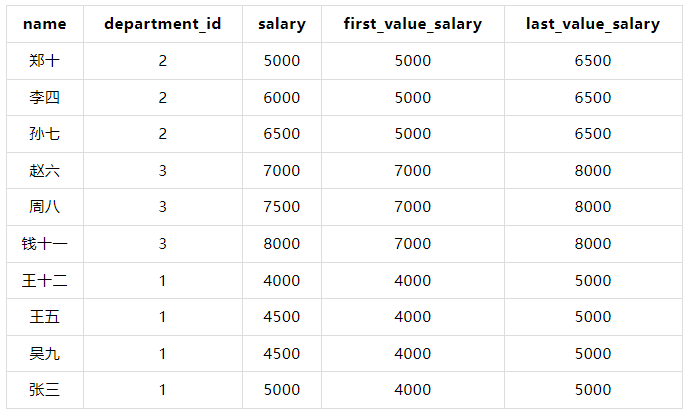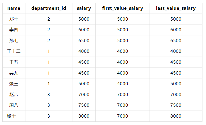 FIRST_VALUE(salary) OVER (PARTITION BY department_id ORDER BY salary) AS first_value_salary,