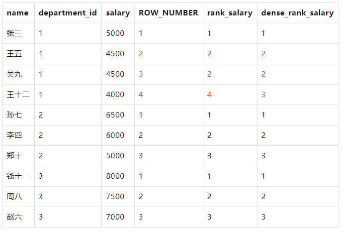 DENSE_RANK() OVER (PARTITION BY department_id ORDER BY salary DESC) AS dense_rank_salary