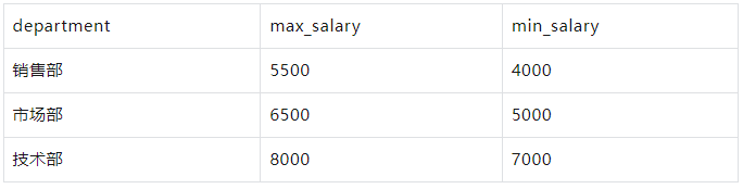 示例-max-min 按部门分组,返回每个部门的最高和最低薪水: