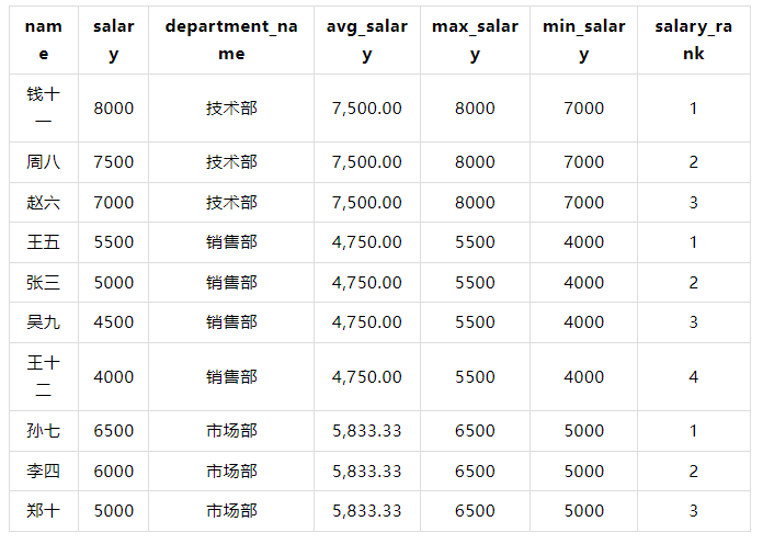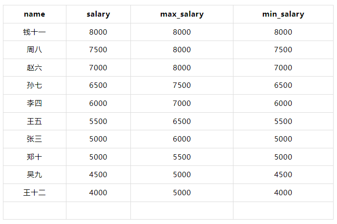 💡在这个示例中,MAX(salary) OVER (ORDER BY salary DESC ROWS BETWEEN 2 PRECEDING AND CURRENT ROW) 和 MIN(salary) OVER (ORDER BY salary DESC ROWS BETWEEN 2 PRECEDING AND CURRENT ROW) 分别计算当前行及其前两行的最大值和最小值。