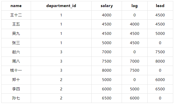 LEAD(salary, 1, 0) OVER (PARTITION BY department_id ORDER BY salary) AS lead_salary