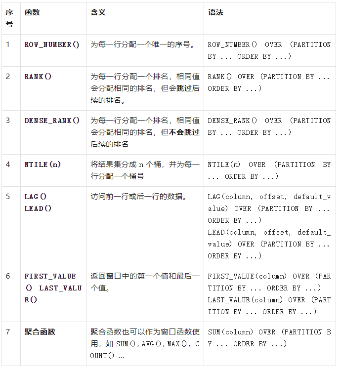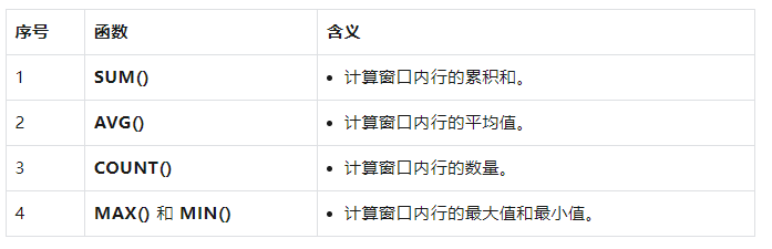 通过上述示例,你可以看到如何使用 FIRST_VALUE() 和 LAST_VALUE() 窗口函数来获取窗口内的第一个和最后一个值,以及如何在窗口中使用聚合函数(如 SUM()、AVG()、COUNT()、MAX() 和 MIN())进行复杂的计算。