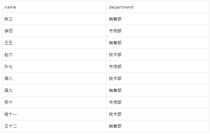 SELECT 1 AS id, '张三' AS name, '销售部' AS department, 5000 AS salary UNION ALL