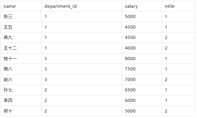 NTILE(2) OVER (PARTITION BY department_id ORDER BY salary DESC) AS ntile_2