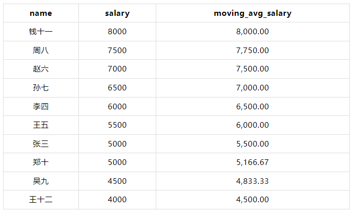 💡在这个示例中,AVG(salary) OVER (ORDER BY salary DESC ROWS BETWEEN 2 PRECEDING AND CURRENT ROW) 计算当前行及其前两行的平均薪水。