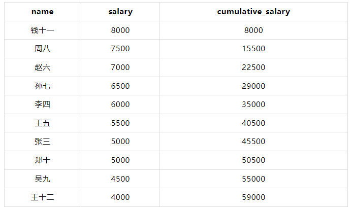 💡在这个示例中,SUM(salary) OVER (ORDER BY salary DESC ROWS BETWEEN UNBOUNDED PRECEDING AND CURRENT ROW) 计算从第一个行到当前行的累积薪水。