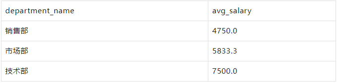 示例-avg 按部门分组,计算每个部门的平均薪水: