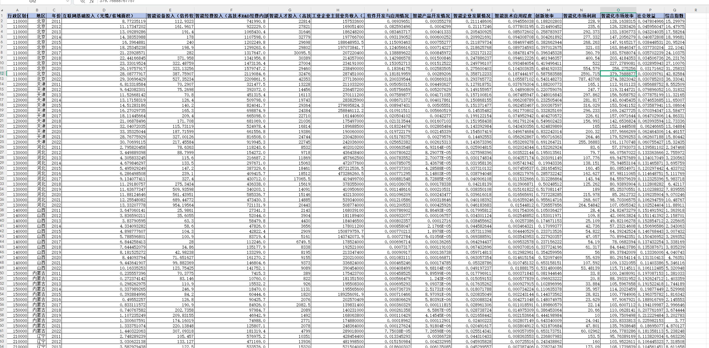 行政区划代码 地区 年份 互联网基础投入(光缆/省域面积) 智能设备投入(信传软件服务业固定资产投资额) 智能经费投入(高技术R&D经费内部支出(万元)) 智能人才投入(高技术制造业RD人员) 工业企业主营业务收入(万元) 软件开发与应用情况 智能产品开发情况 智能企业发展情况 智能技术应用程度 创新效率 智能化市场利润 智能化市场效率(每万元/人) 社会效益 综合指数