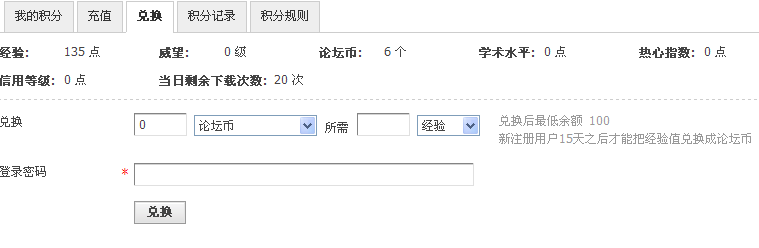 点击右上角“积分”,然后点“兑换”,10个经验值可以换一个论坛币