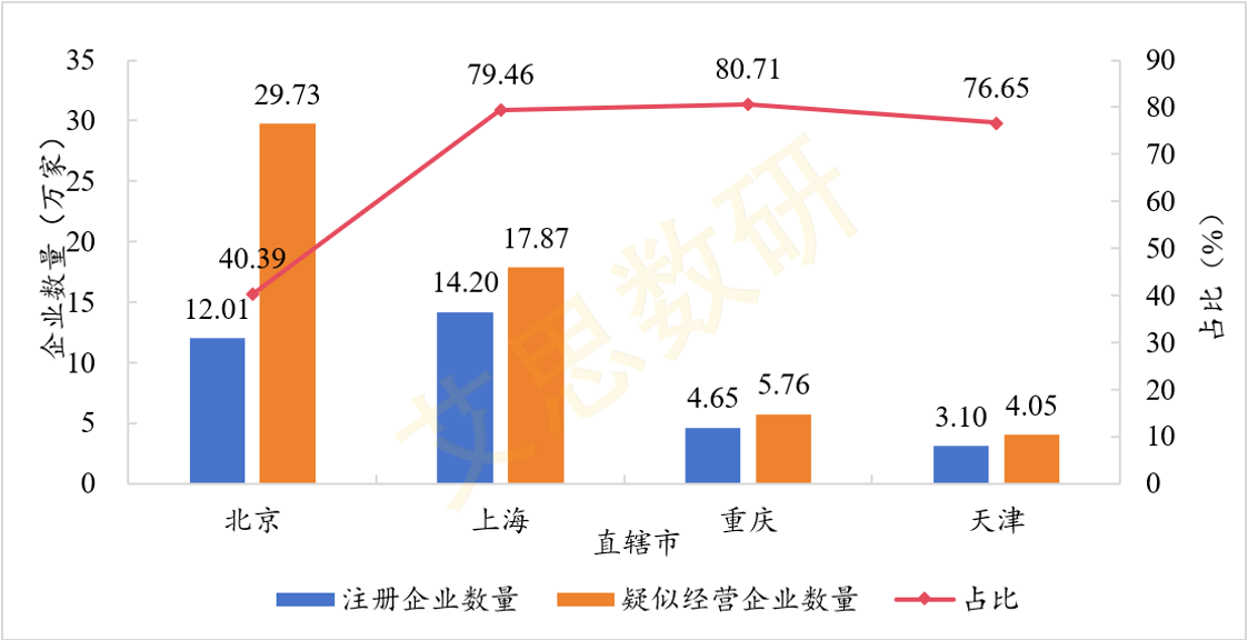 图5 直辖市注册和疑似经营企业数量及占比