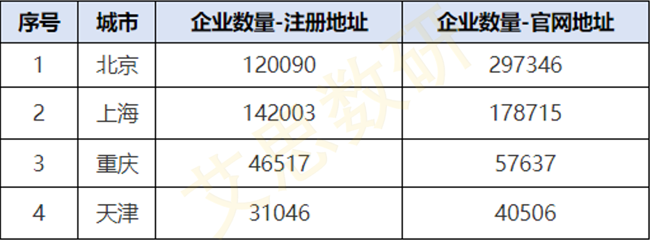 基于艾思企业经营地址库,以有官网地址来源的企业作为样本。先按企业披露的官网地址,筛选出北京、上海、重庆、天津的企业数量;再依据企业注册地址,统计这四个直辖市的注册企业数量,具体数据见表4。