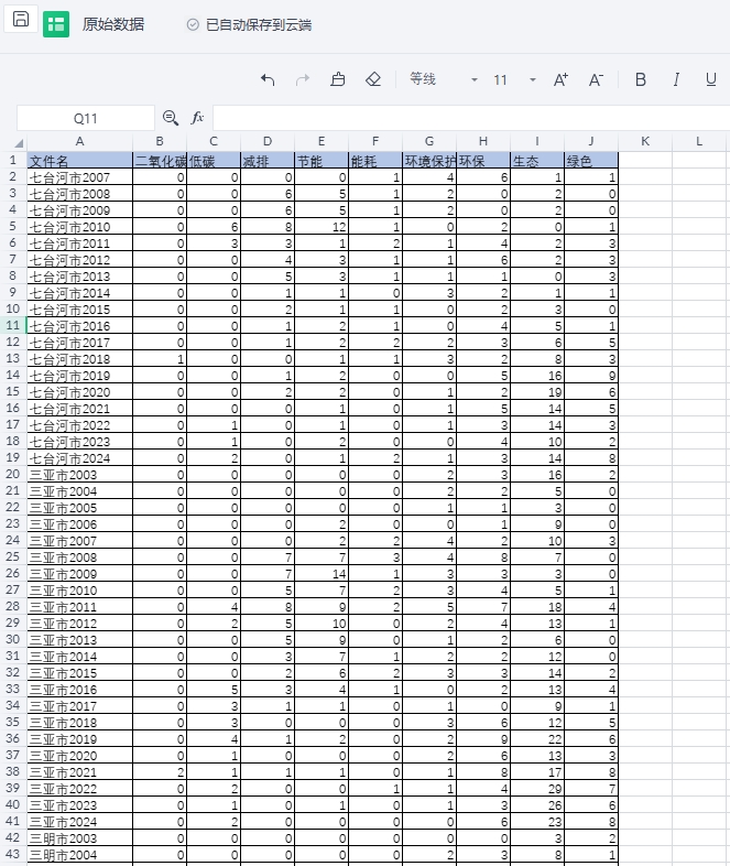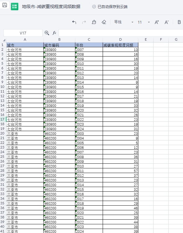 一、政府减碳重视程度词频数据的介绍本分享数据借鉴佟岩(2024)老师的做法,采用各年度省级政府工作报告中“减碳”关键词的词频总数来衡量地方政府对“减碳”工作的重视程度。“减碳”关键词包括二氧化碳、低碳、减排、节能、能耗、环境保护(环保)、生态、绿色等。