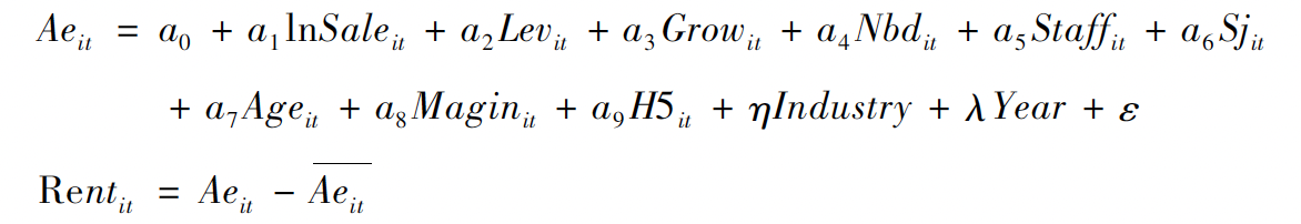 指标测度方法:借鉴C刊文献提出的估计模型,计算超额管理费用作为企业寻租的替代变量,具体模型如下: