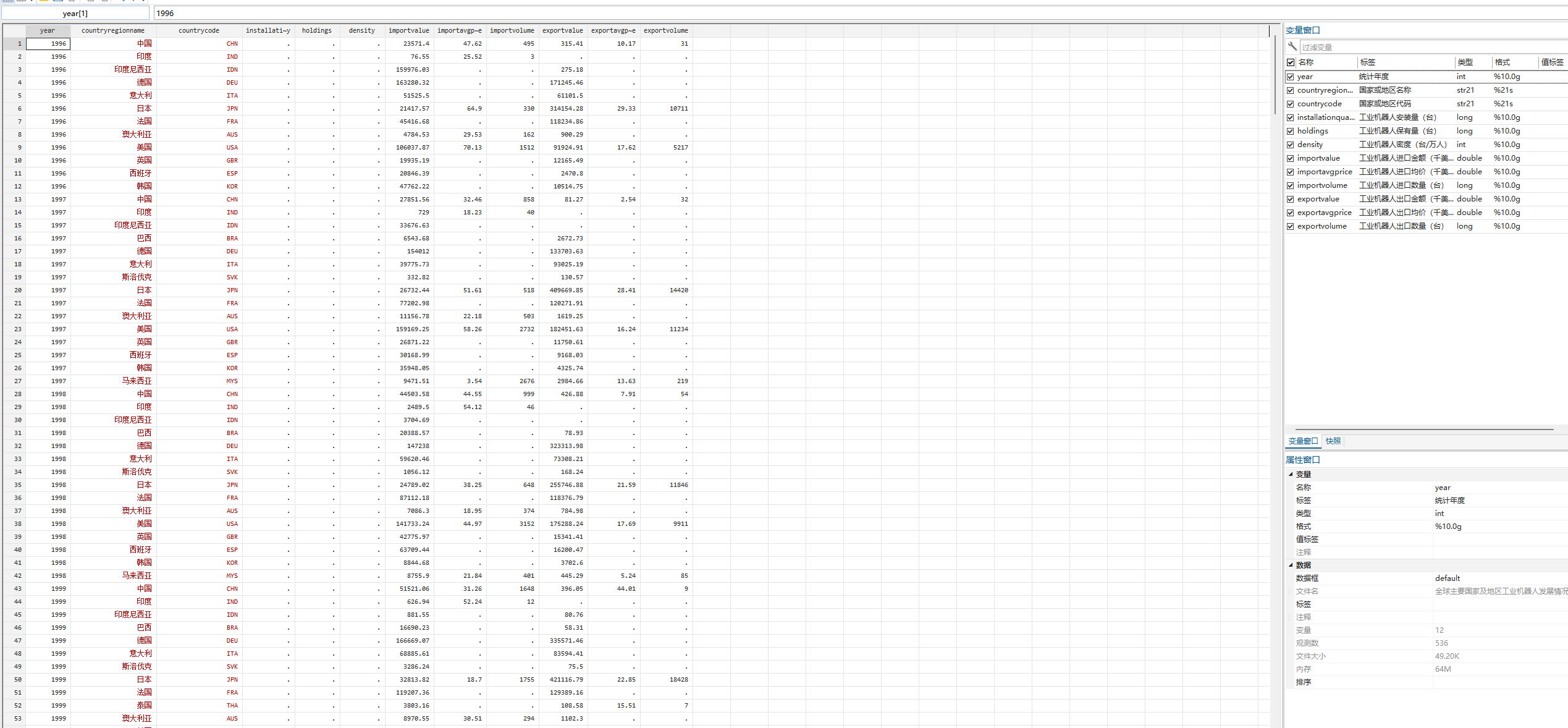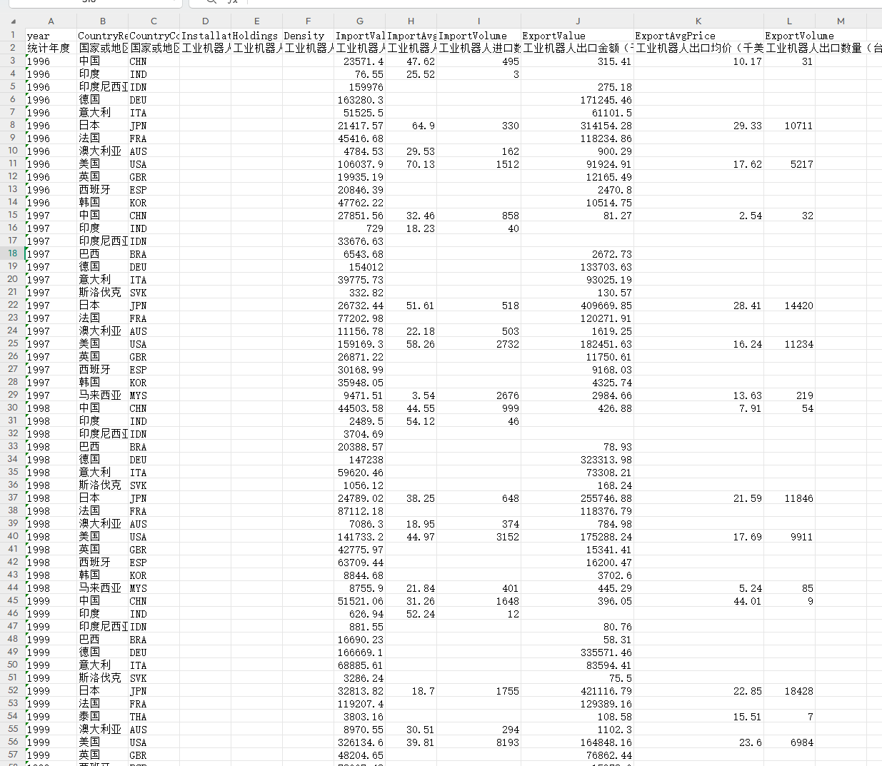 ▪ 数据说明:全球主要国家及地区工业机器人发展情况包括 安装量、保有量、进口情况、出口情况等变量,数据提供.dta和.xls两种格式,可用STATA或EXCEL打开。