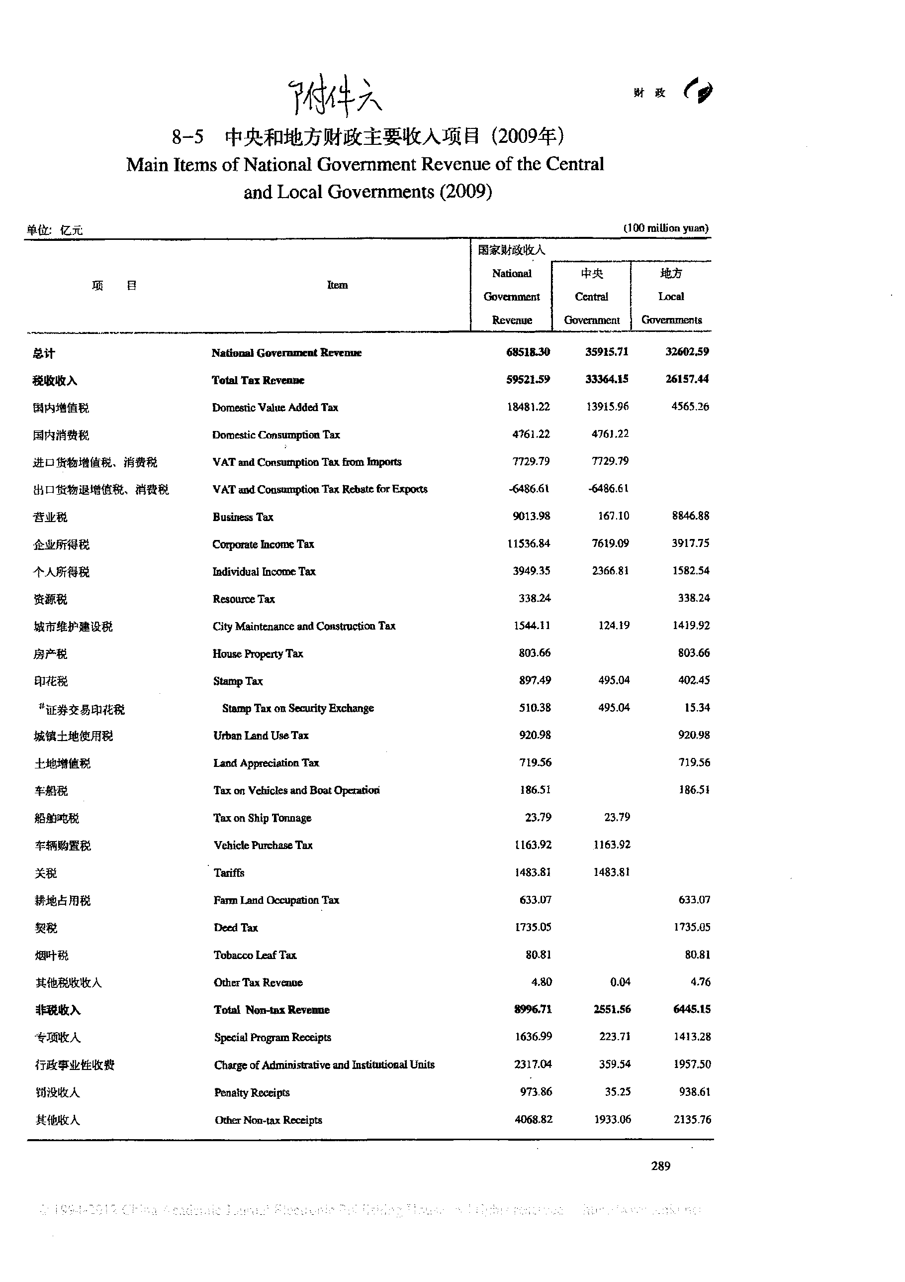 7、国家财政分项目收入《中国财政年鉴》2010年429-430页;